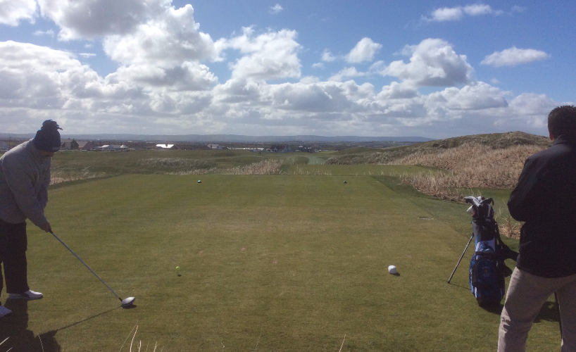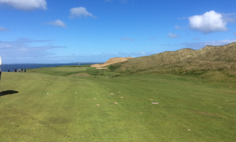 The fourth is the first of the back-to-back par fives and measures 508 yards. The day we played it, there was a strong wind into our face. This meant that the fairway bunkers could not be reached, so as long as your drive did not veer 20 yards in the wrong direction, there was not much to worry about. Similarly, there were no obstacles to be navigated on the second shot. The same was true on the fifth. However, both greens were well protected by bunkers that prevented shots from running up to the green. Though, those greenside bunkers are more likely to come into play on a calm day when a player may try to run a second shot up to the green, which was impossible for us given the wind. We were left hitting third shots that should not have required any bump and runs. The most memorable moment of the day did come on the fifth hole when Jimmy holed out his fourth shot (about 75 yards) from the fairway for birdie. Jimmy had quite the dynamite wedge and short game. For the first two holes he was struggling because he left his sixty degree wedge back in New York. I let him take mine for the rest of the round because I never use that club (especially in windy Ireland), but it worked for Jimmy as he happily hoisted his 60 yard shots sky-high into the swirling winds.